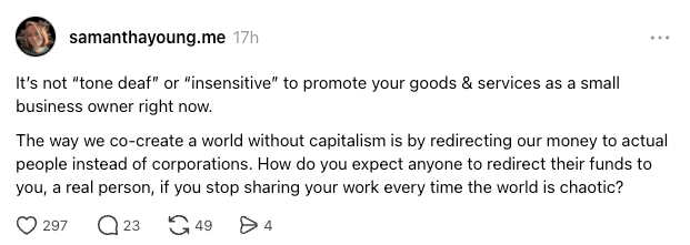 Because when the same platforms where we’re expected to do our marketing are live streaming genocide and illegal wars and state violence and climate catastrophe, to name but a few of the horrors that persist in 2026…