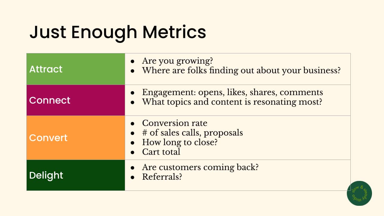 For data to actually be helpful, identify just enough of the right metrics to drive decision making and strategy without it becoming an overwhelming or anxiety-inducing task on your already full to-do list.