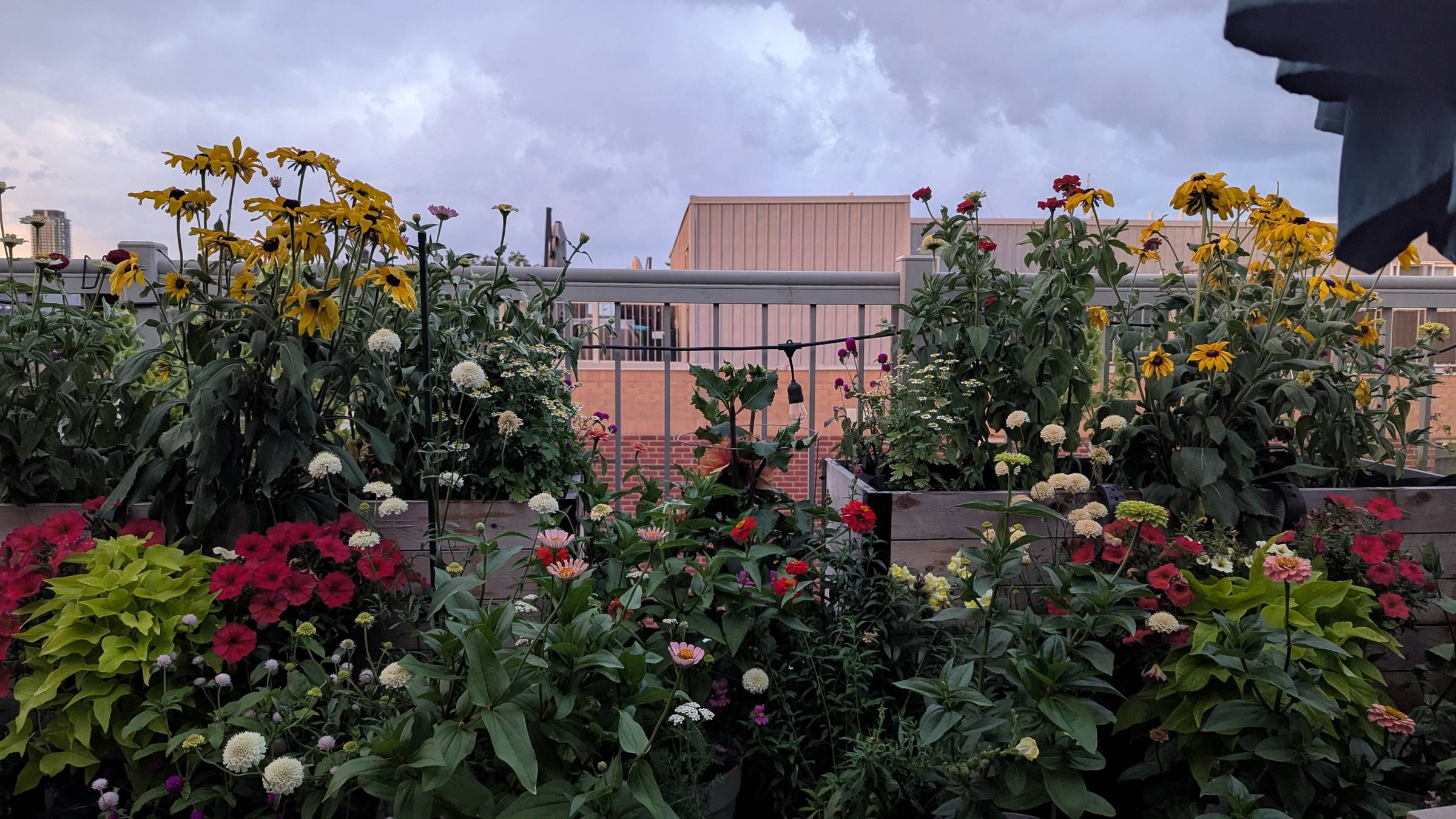 Lush and abundant. Not perfect — the zinnias a little too red, the petunias a little too orange, the dahlias tipping out of their cages — but undeniably thriving.