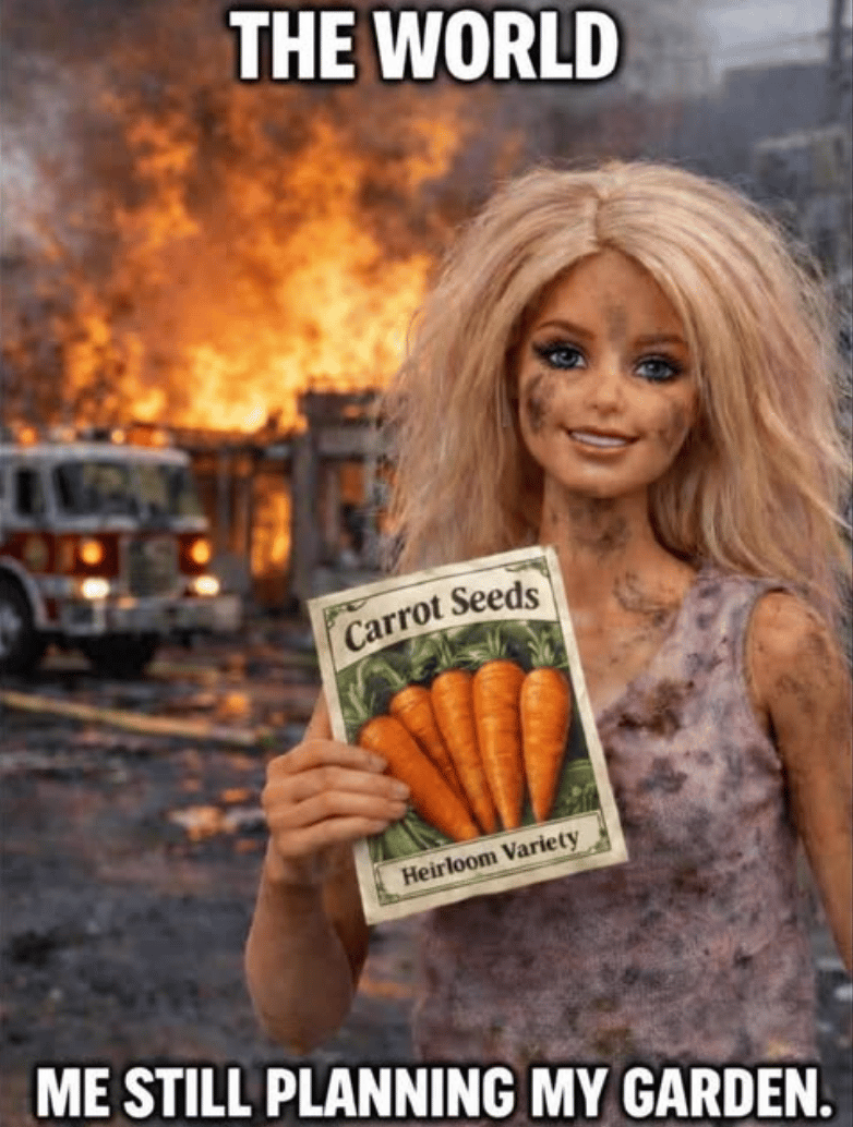 Those Barbie memes get me LOL-ing every time I see one on my feed. There’s Barbie, looking like she just crawled out of the rubble; hair all over the place, clothes stained with soot, dark circles under her eyes. Sometimes she’s smoking a cigarette which really makes me laugh. And in the background there will be a picture of a raging fire, a bombed out building, a screenshot of a White House press conference with the headline "more bad news!" The caption will be something like me still...